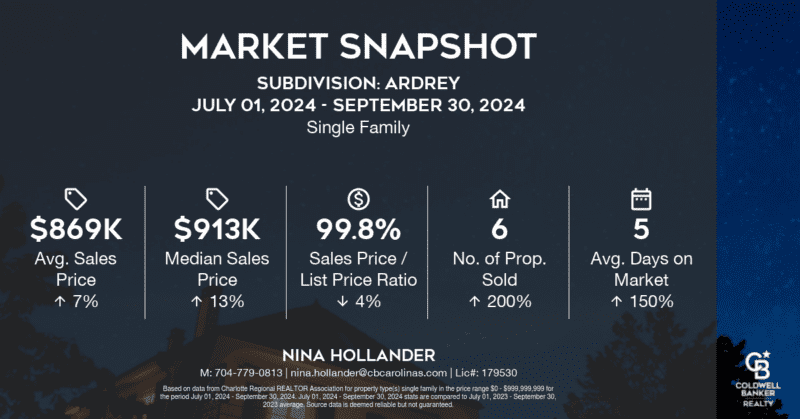 I’ve been opening doors for Ballantyne area and Ardrey home buyers and sellers since 1999. If you’re considering purchasing or selling a home in Ardrey or anywhere in the Ballantyne area, contact Nina Hollander with Coldwell Banker Realty in Ballantyne. I’ve been an Ardrey resident since 2006 and a Ballantyne neighborhood specialist and resident since 2001.